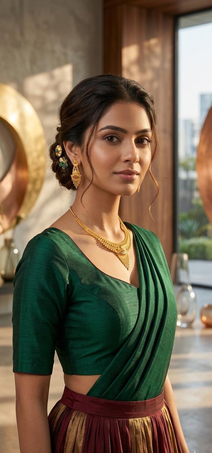 This jewelry set is a masterpiece of Traditional Indian Craftsmanship blended with a modern, structured silhouette. The design is centered around a V-Contour silhouette, specifically engineered to sit gracefully along the neckline, providing a regal and elongated appearance. It is a “Collar-Style” set that captures the essence of heritage royalty.