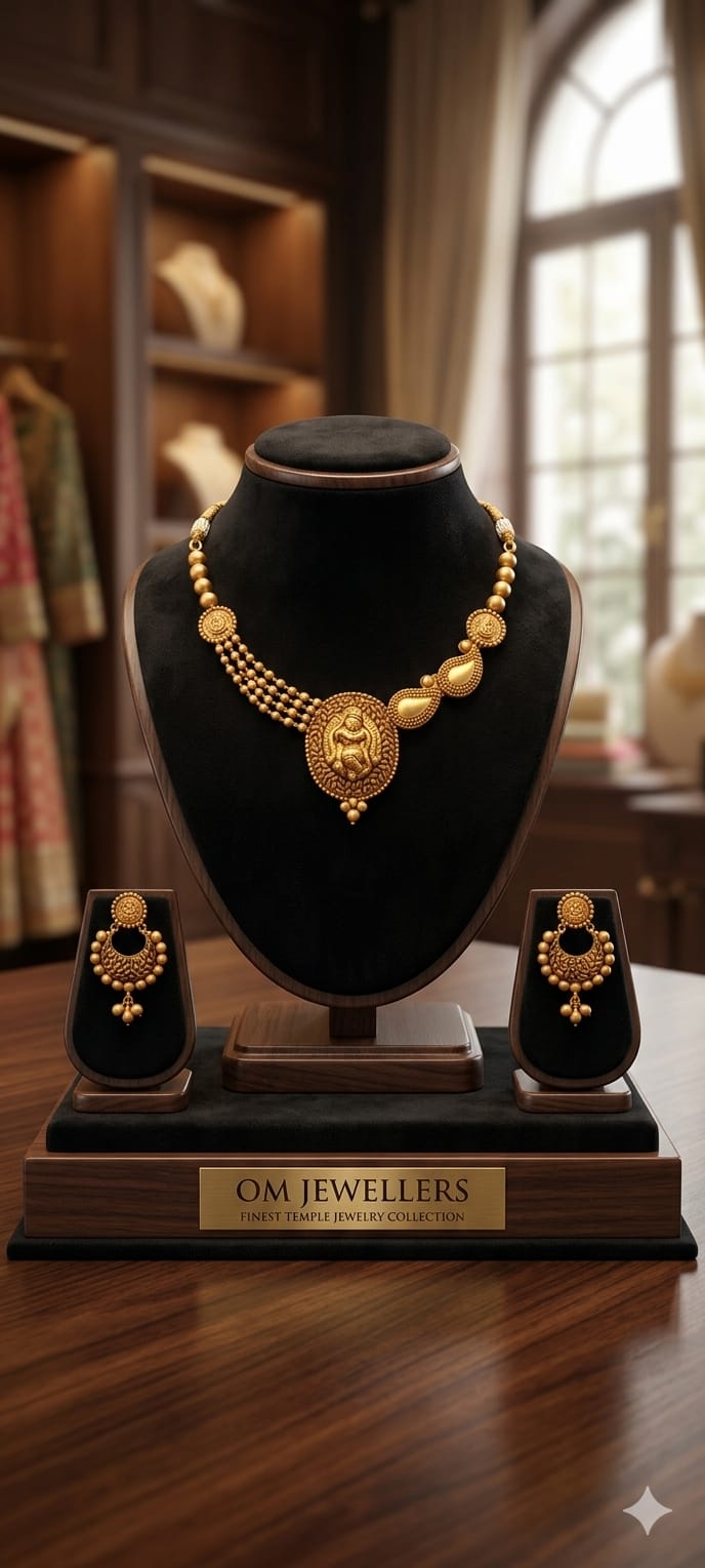 Embrace the essence of spirituality and heritage with this masterfully crafted Temple Jewelry ensemble. Featuring sacred motifs and a rich antique matte finish, this set is designed for those who value tradition and exquisite craftsmanship.