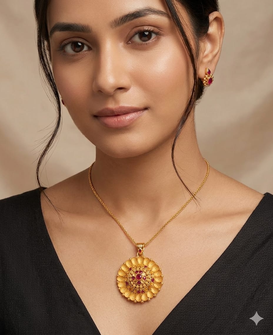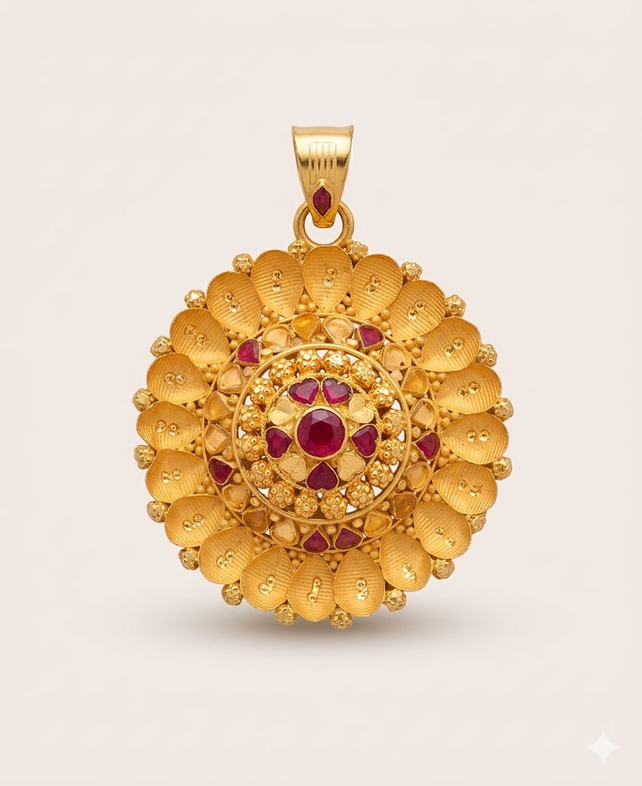 Adorn yourself with a masterpiece crafted in 91.6% pure 22k gold. This floral-inspired pendant, accented with deep red rubies, is a testament to fine artistry and unwavering quality.