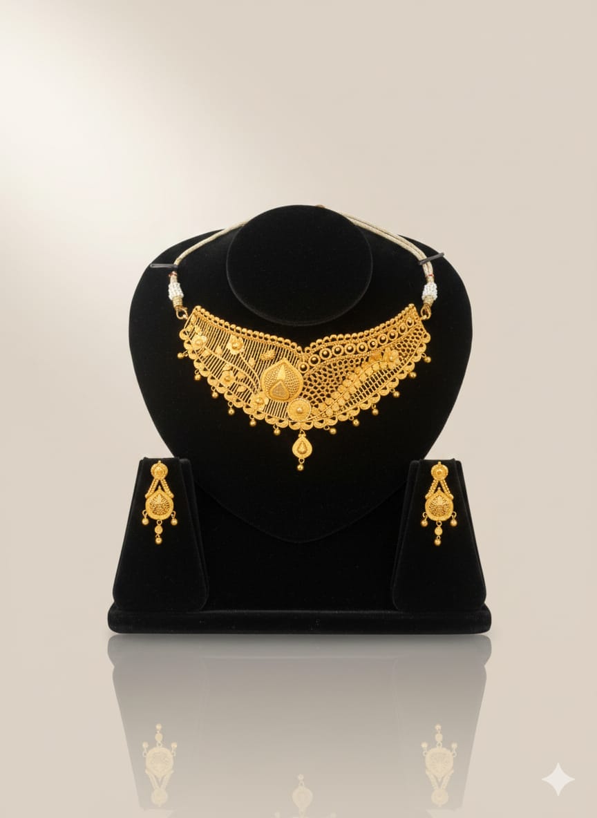 Grace your most special occasions with this breathtaking necklace set, a true masterpiece of traditional gold artistry. This set features a grand choker-style necklace paired with matching drop earrings, designed to offer a royal and timeless look.