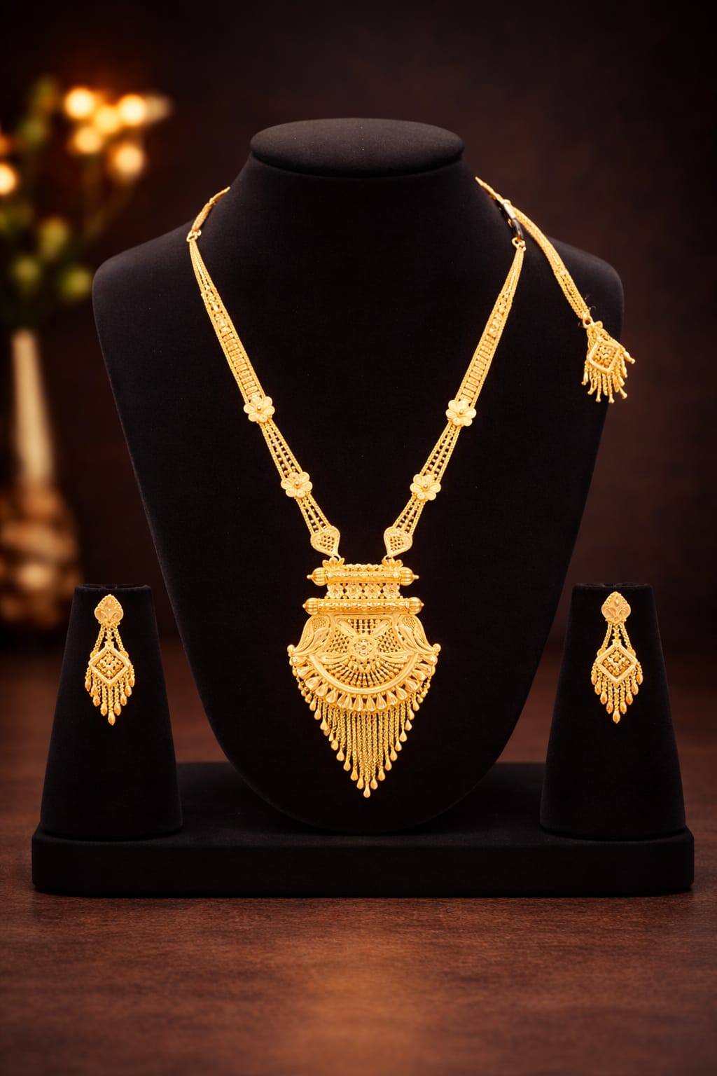 Matching Earrings: Elegant drop earrings that perfectly mirror the pendant’s design, completing this regal ensemble.