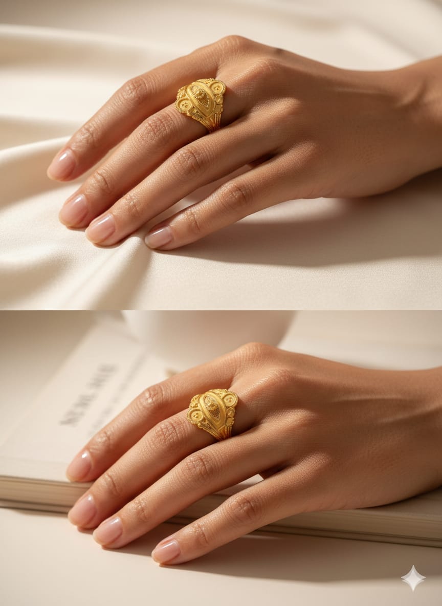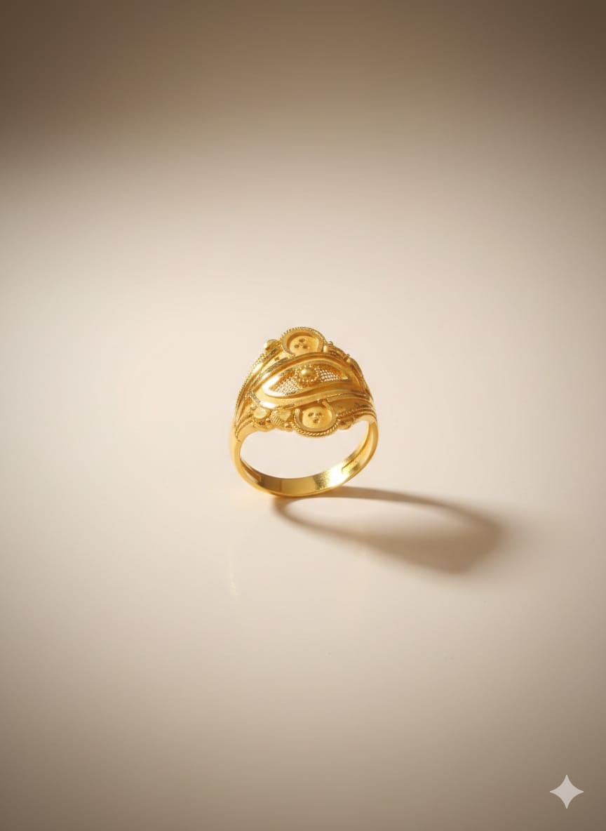 This ring features exquisite filigree work, blending traditional artistry with a radiant glow.”