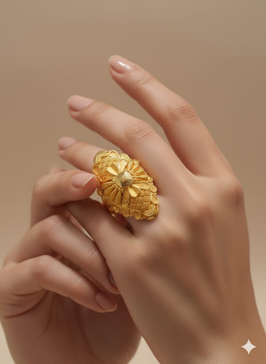 • Design: An exquisite, oversized cocktail ring featuring intricate filigree work and a traditional floral sunburst motif.