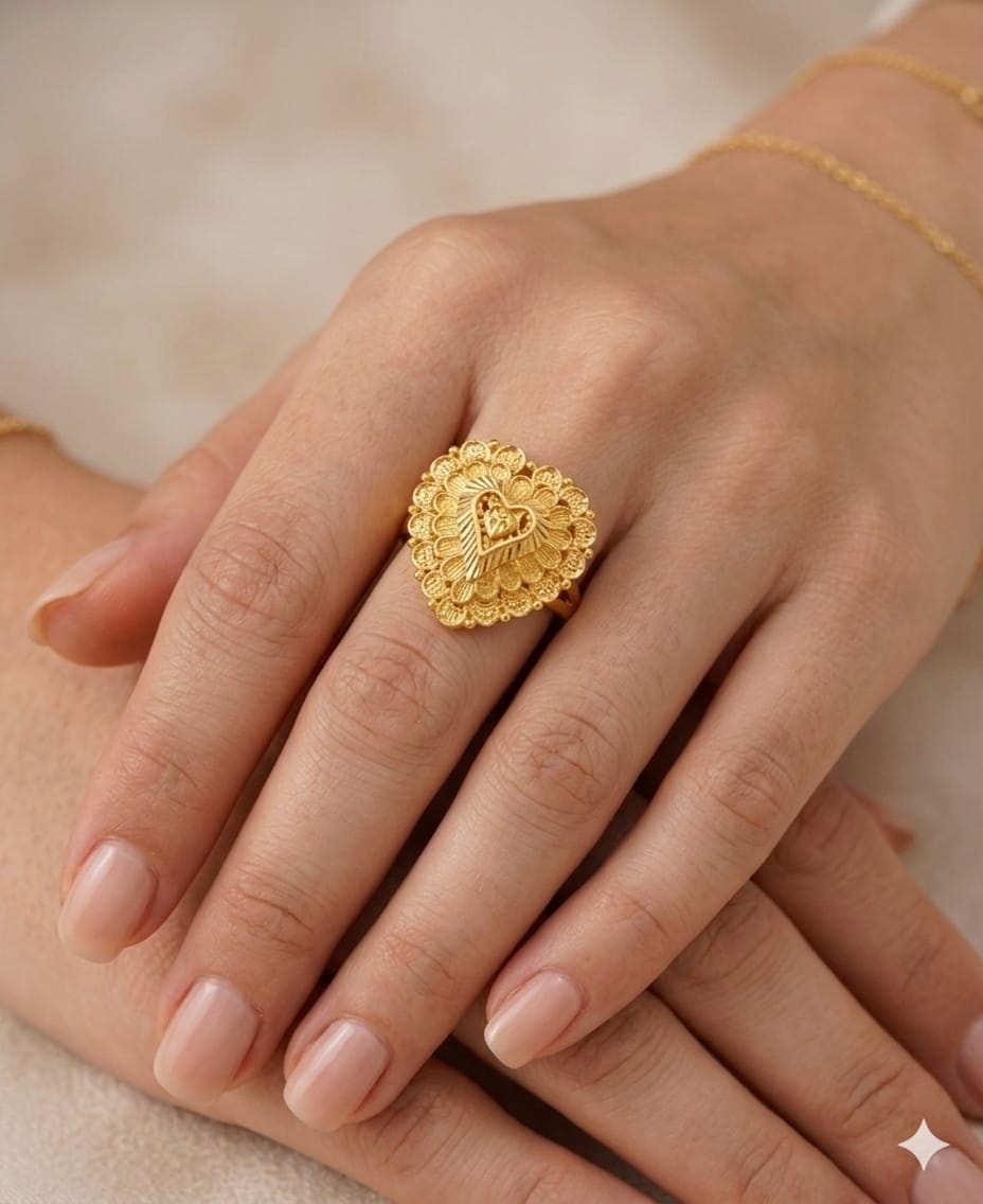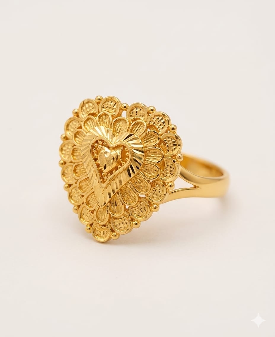 Celebrate elegance with this masterfully crafted heart-shaped ring. Designed for the modern woman who appreciates traditional craftsmanship, this piece features intricate gold beadwork and a radiant polished finish.
