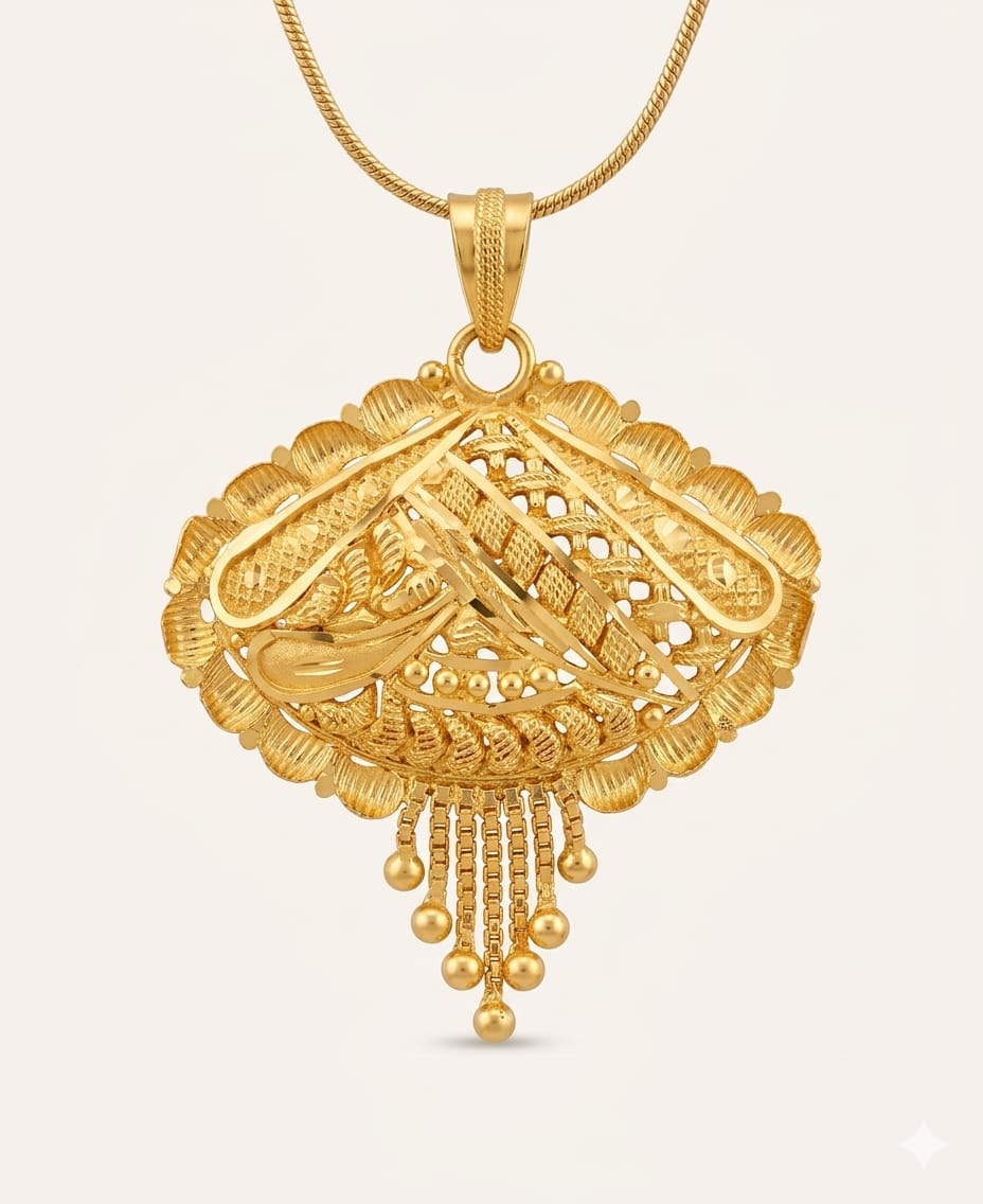 Adorn yourself with the golden glow of tradition and superior craftsmanship. This intricately designed gold pendant is a celebration of fine artistry, featuring a grand silhouette with delicate textures and a dangling bead finish that adds grace to every movement.The Om Jewellers Promise