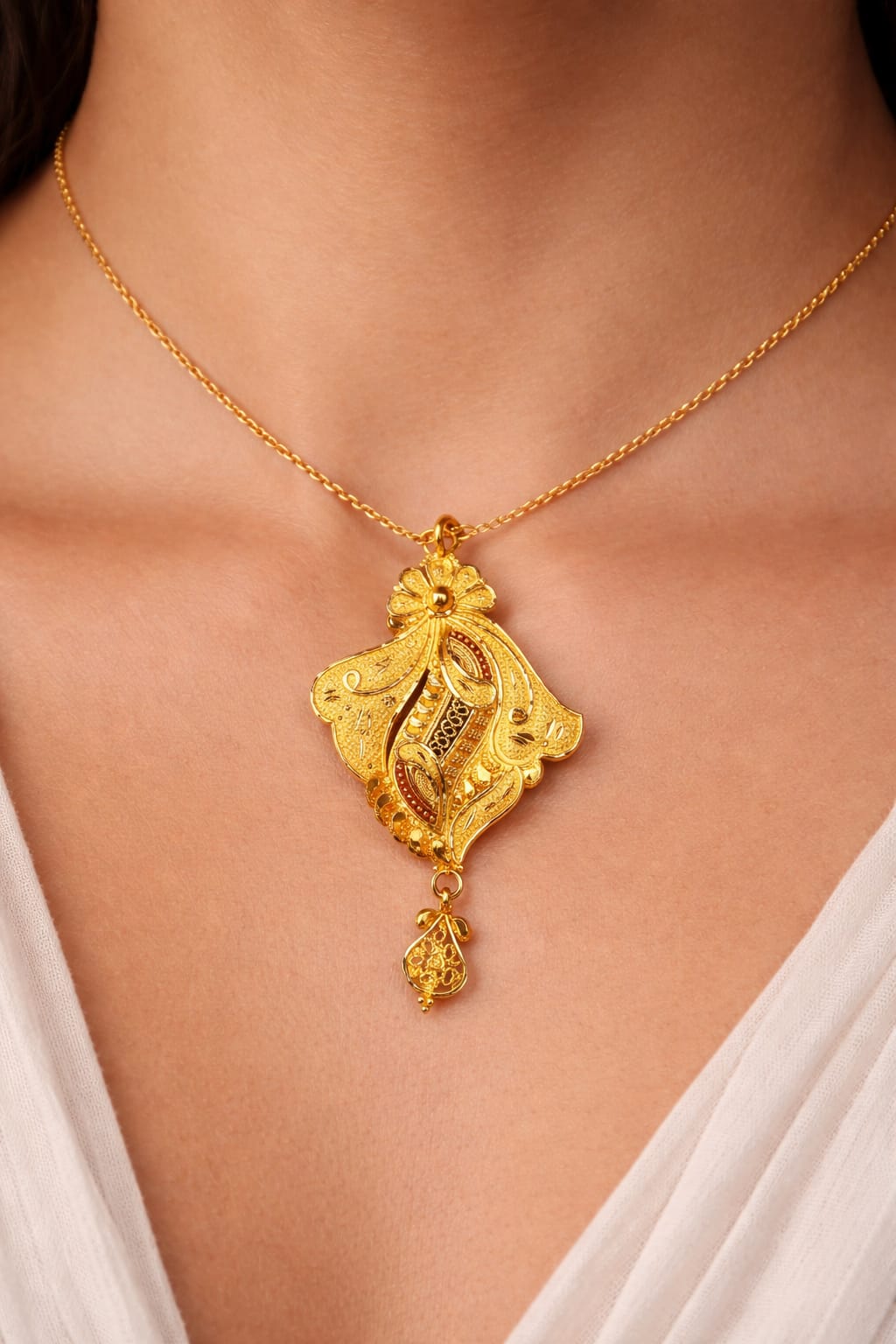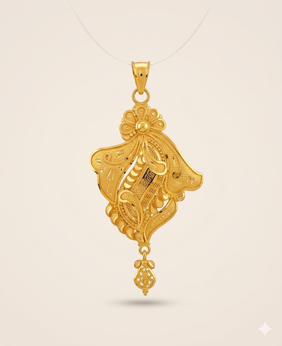 An exquisite blend of traditional artistry and fluid design, this 22k gold pendant features a stunning paisley (Kalka) motif. The piece is adorned with delicate textured patterns, fine beadwork, and a dangling gold drop that adds a touch of movement and grace.