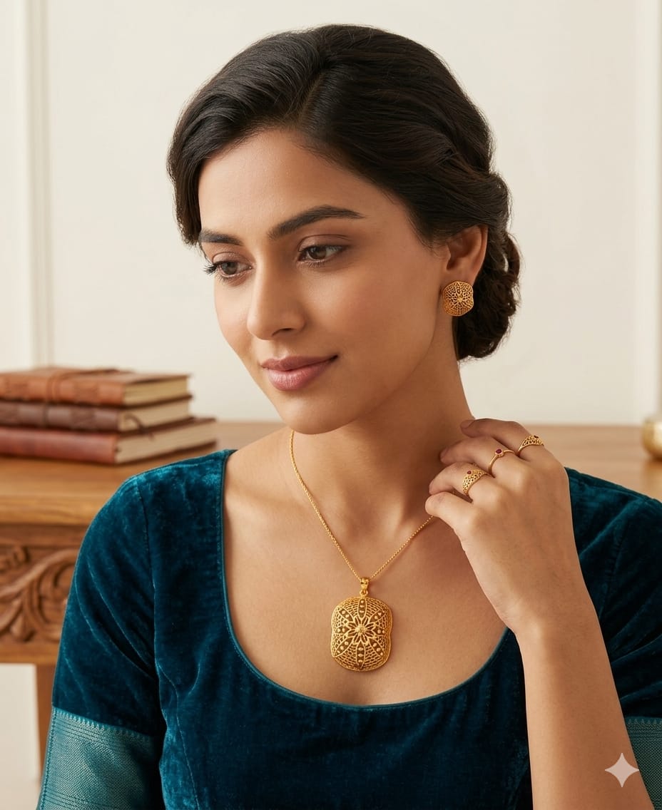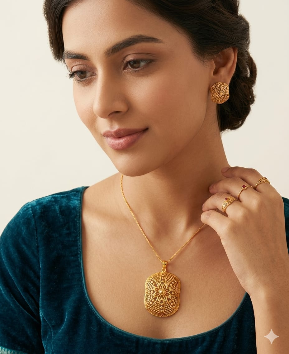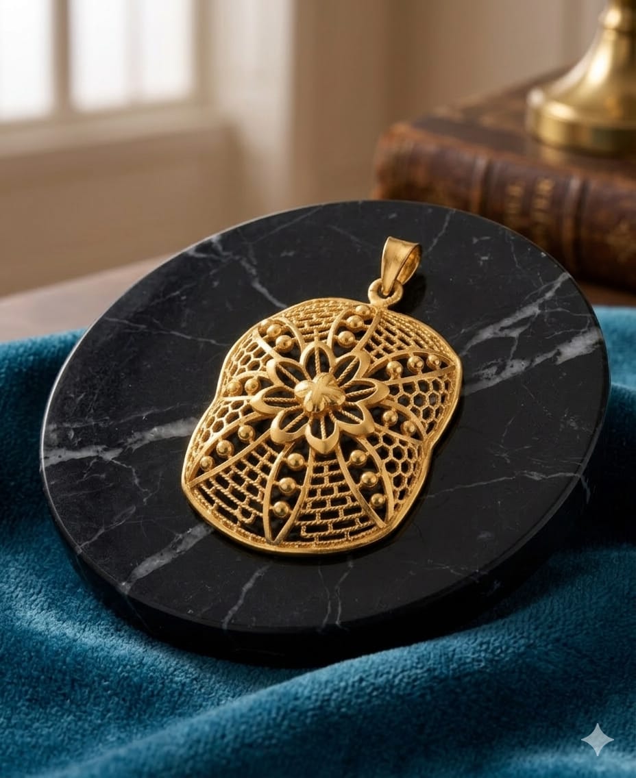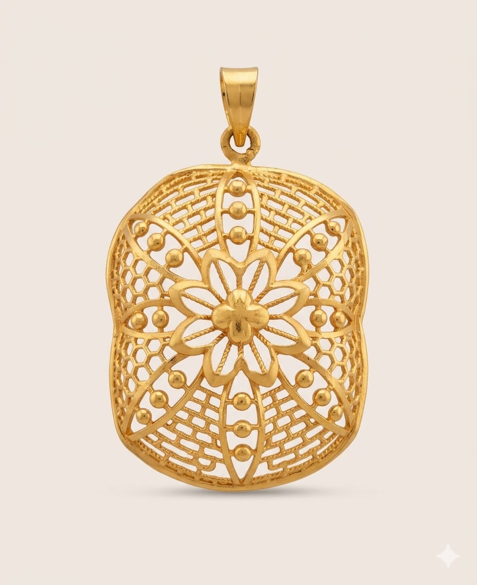 Detailed Product Presentation: 22k Gold Modern Filigree Floral Pendant