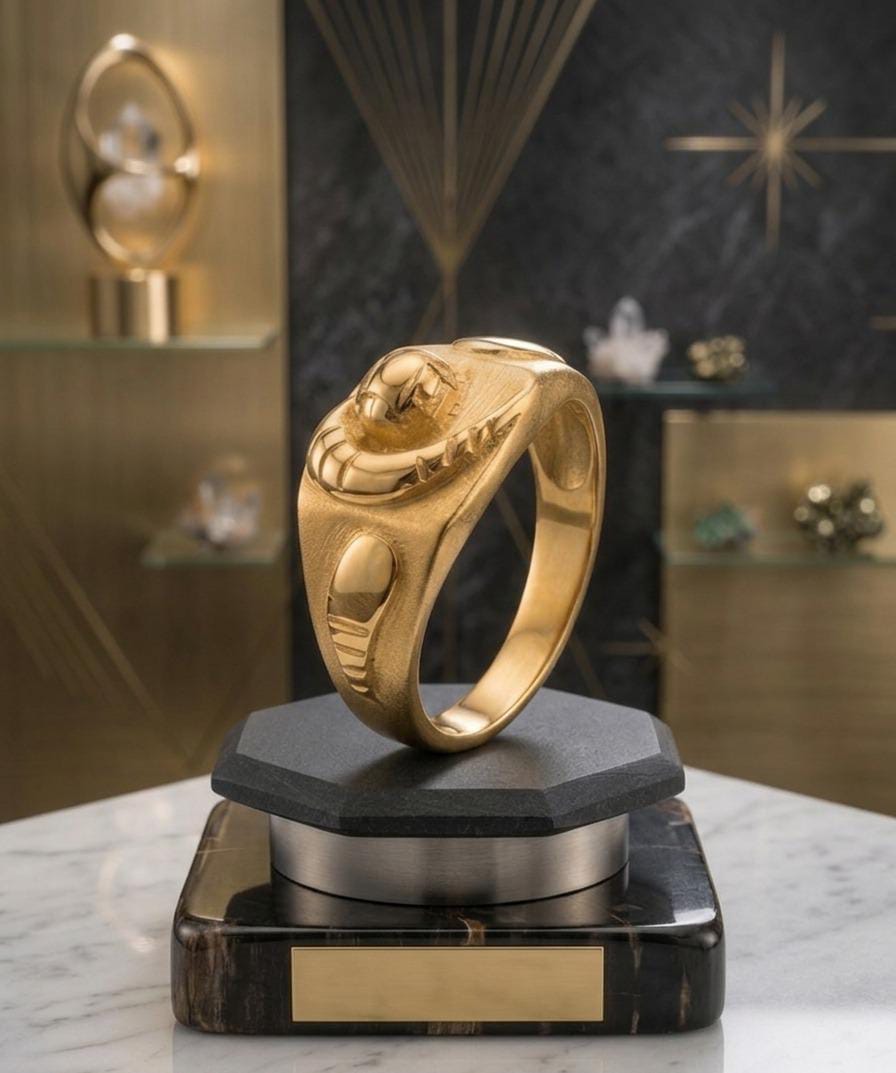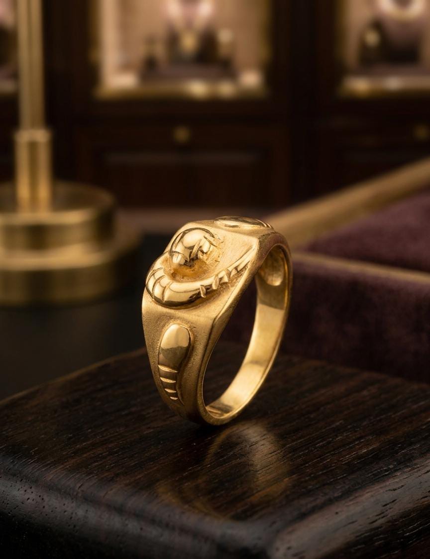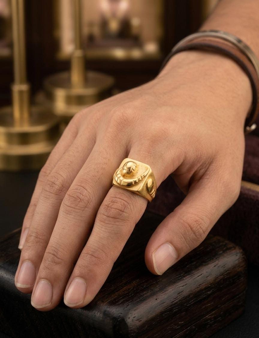 This 22K gold signet ring is a bold departure from conventional jewelry, representing a fusion of “Modern Sculpture” and “Fluid Dynamics.” Crafted in 91.6% pure gold, it is designed for the man who views his jewelry as a wearable piece of art—strong, unique, and deeply expressive.